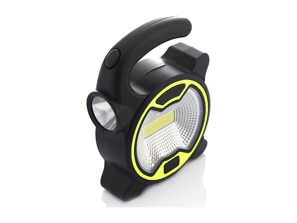 Potente lámpara de linterna LED COB con soporte para batería halógena Especificaciones técnicas: Código de producto: 11303_Ż Alta calidad de mano de obra Material: Plástico Fuente de energía: 3 baterías AA (no incluidas) Tiene un punto LED incorporado Dos modos de iluminación: luz frontal y luz lateral Diseño ergonómico Mango cómodo Ligera y manejable Multifuncional Luz frontal: 1 LED de 1W Luz lateral: 8 LEDs COB de 3W Color frío Certificado CE Color: amarillo Dimensiones: Alto: 13 cm Ancho: 9,5 cm Fondo: 3 cm El set incluye: Lámpara nueva y embalaje original
