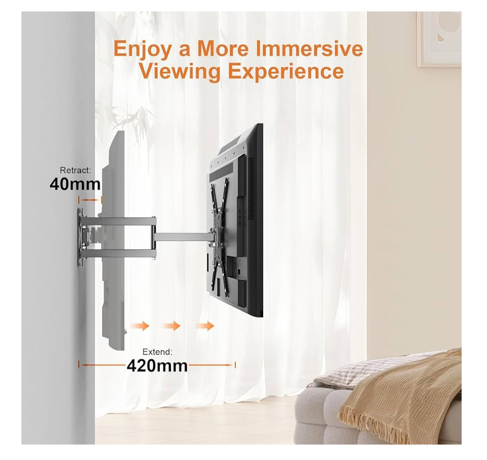 - Ahorrar Espacio: Nuestro soporte de TV pared se puede extender 420 mm y se retrae a 40 mm para ahorrar espacio y mantener su hogar hermoso y ordenado. También le permite montar su televisor en la esquina.