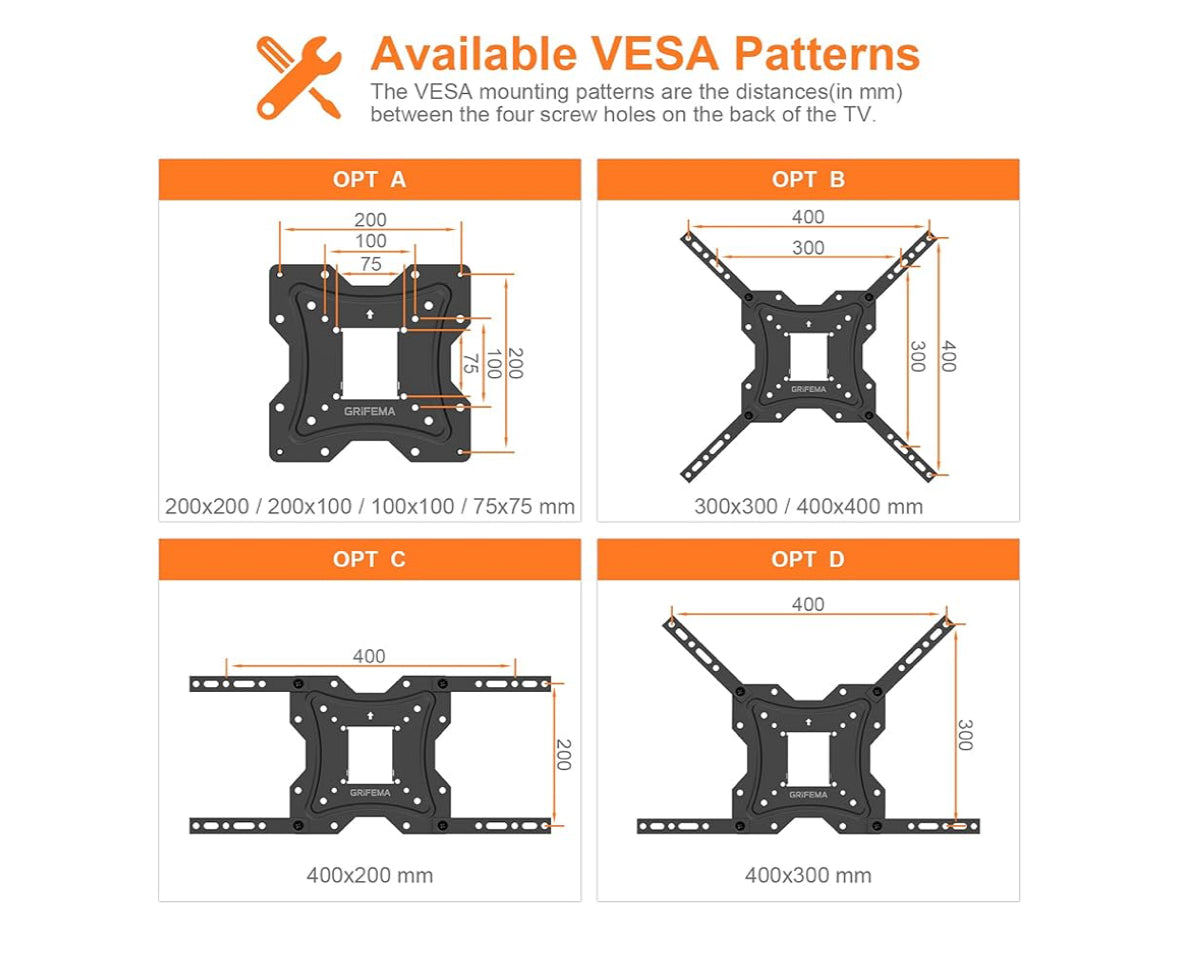 - Soporte Universal para TV: Este soporte de pared para TV se adapta a la mayoría de televisores de 26 a 65 pulgadas, que tiene una capacidad de carga de hasta 30 kg. Es compatible con la norma VESA (patrón de orificio de montaje): 75x75/100X100/200x100/200x200/400x200/400x400 mm. Antes de comprar, confirme el VESA, el peso y el tamaño de su televisor.