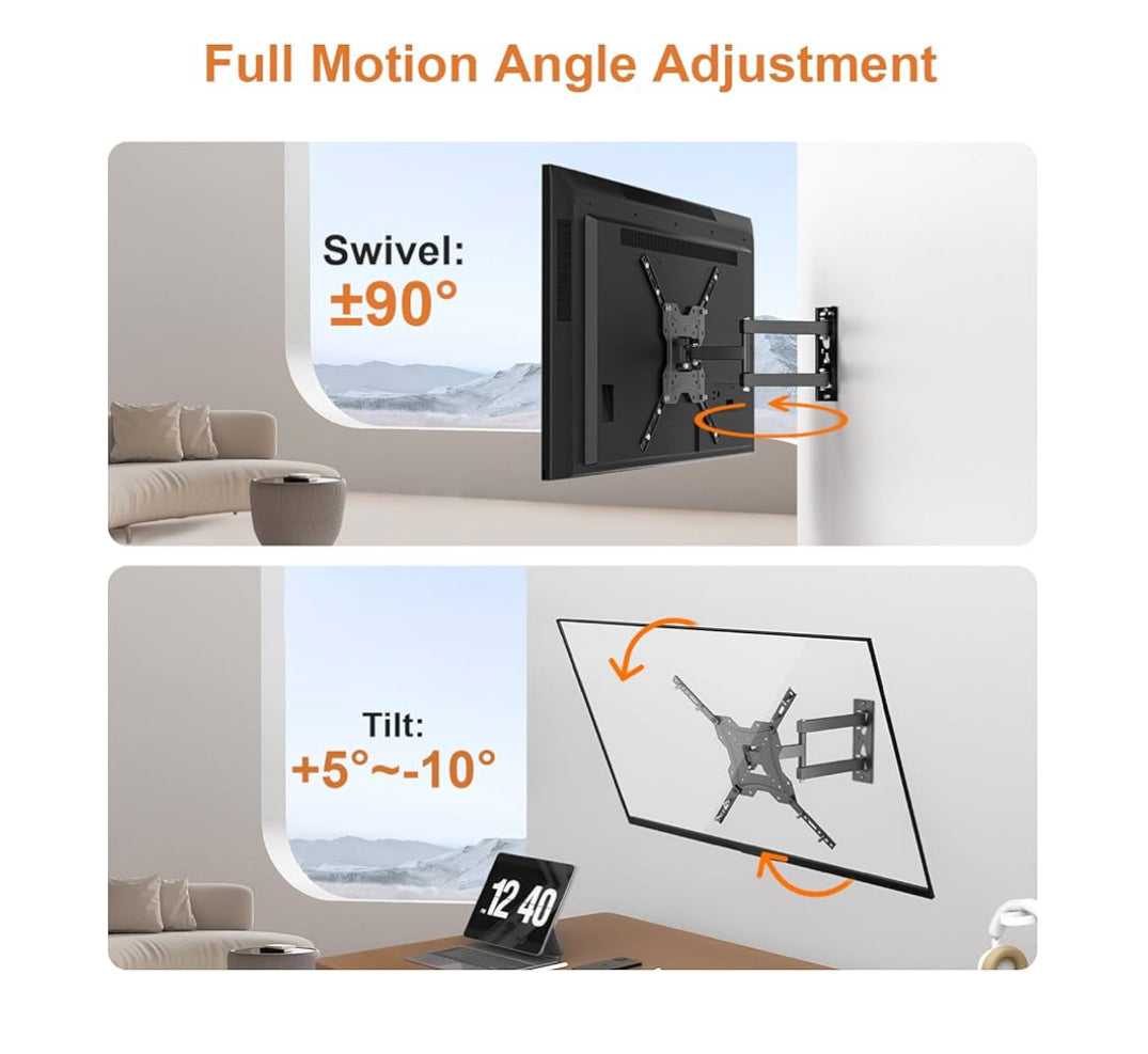 - Movimiento Completo para una Visualización Óptima: El soporte del televisor permite una inclinación de +5°/-10° para reducir el deslumbramiento de la pantalla y gira 90 ° hacia la izquierda o hacia la derecha para ajustar fácilmente la pantalla, proporcionando una excelente experiencia de visualización.